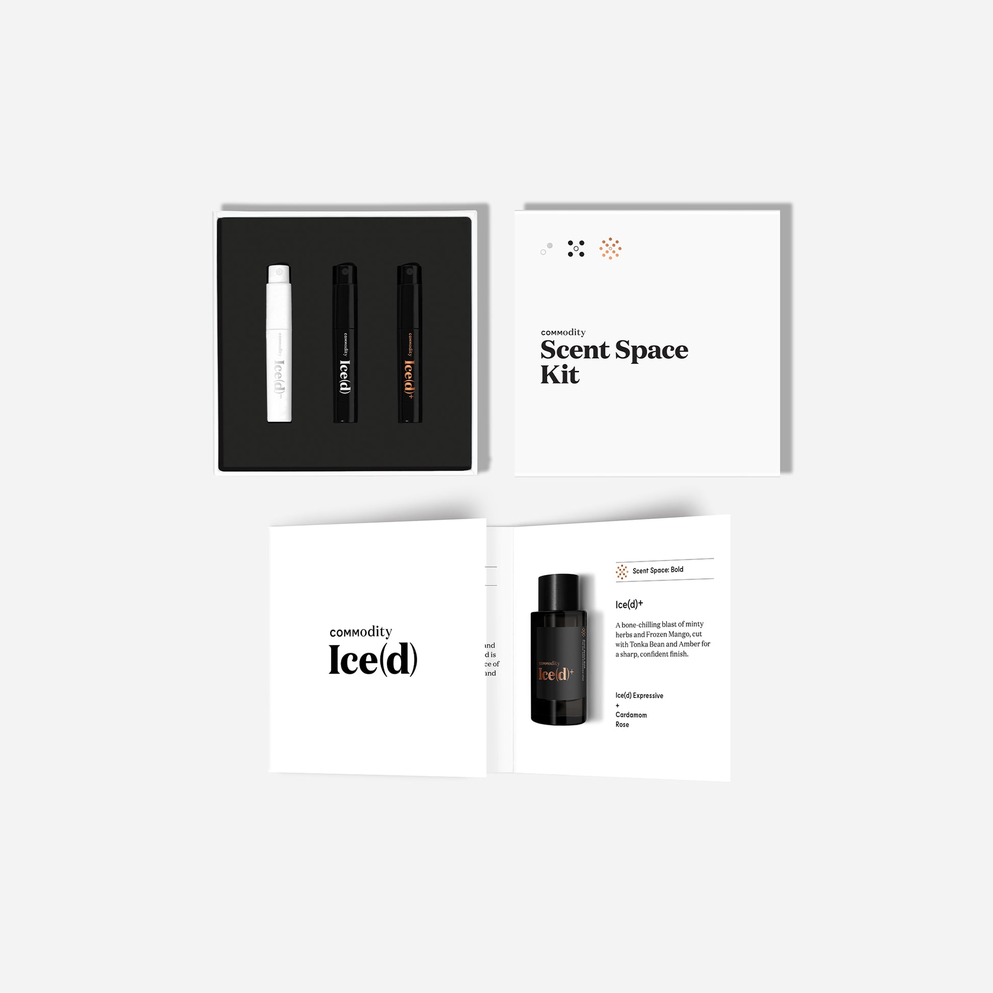 Ce kit comprend Ice(d) dans les 3 versions de Scent Space : une version Personal qui se projette au plus près, une version Expressive remarquablement unique et une version Bold qui remplit la pièce.