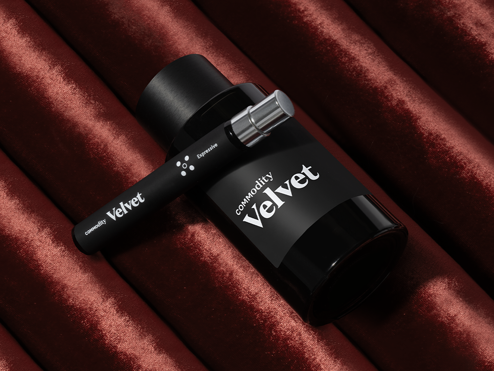 "Pour Commodity Velvet, j'ai été inspirée par l'image de pétales de roses turques vibrantes flottant doucement sur un fond mystérieux et sombre de vanille richement chaude et d'ambre noir, avec une délicieuse touche d'amande grillée flottant dans l'air. Pour Velvet Personal, j'ai utilisé la délicatesse des pétales de rose turque mélangés à la fraîcheur de l'eau de coco et à la richesse de la vanille. J'ai terminé par des bois blancs chauds tout en éliminant l'ambre noir pour créer une expérience olfactive globale plus douce" - Jérôme Epinette